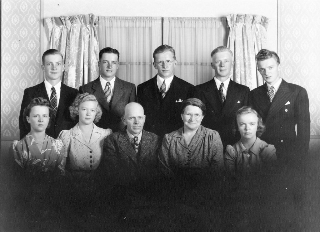 Pictured above is the Carl and Annie Terning family. Front row: Daughters Adella (Brown), Ethel (Hess), parents Carl and Annie, and daughter Alice; Back row: Sons Marlin, Ralph, Earl, Howard, Ellsworth (Joe).